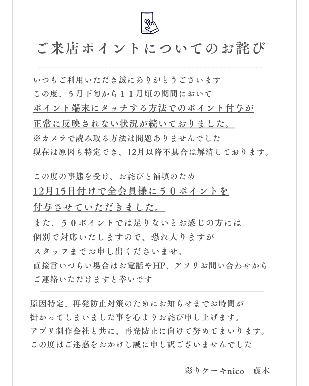 このたび、ご来店ポイントの付与に不具合があったことが判明し、